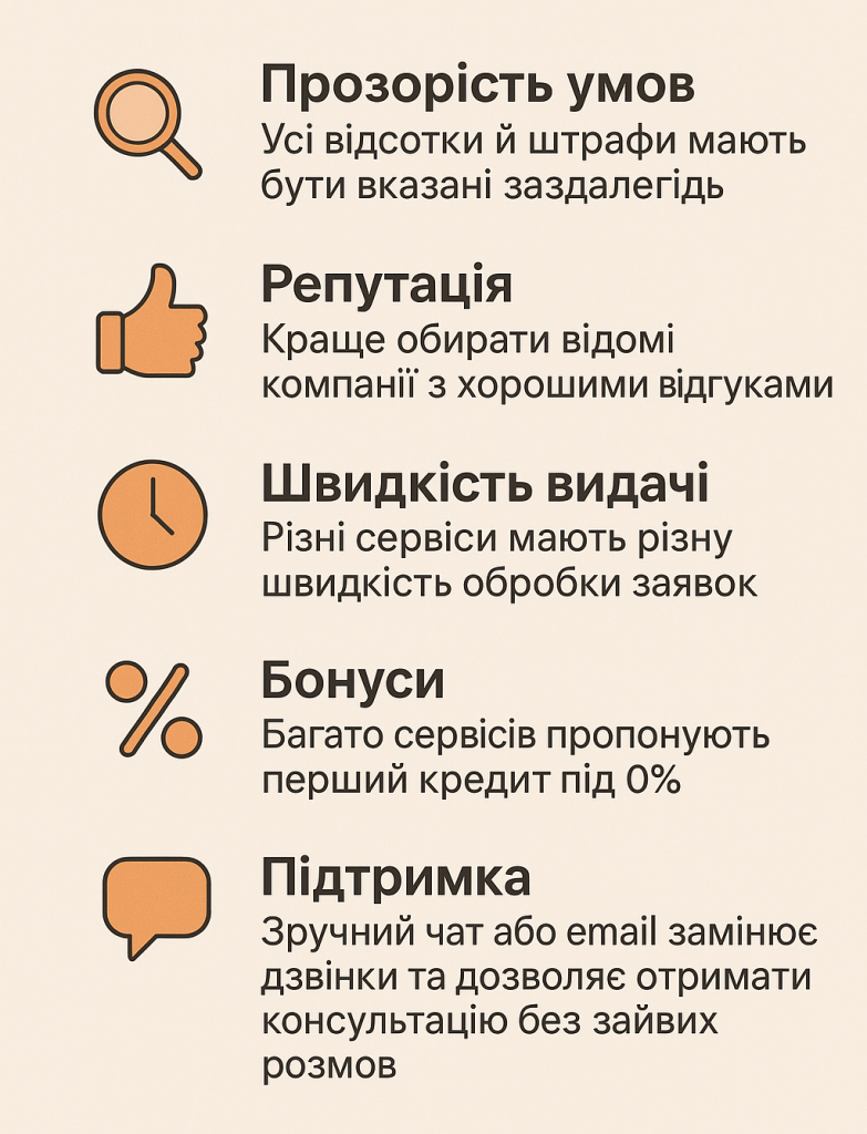 - Прозорість умов. Усі відсотки й штрафи мають бути вказані заздалегідь.