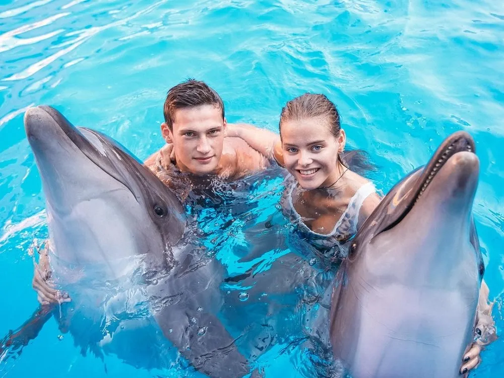 Посетители дельфинария также могут поплавать с дельфинами. За десятиминутное купание с морскими животным паре придется заплатить 7000 гривен. В подарок влюбленные получат фото с дельфинами и картину, которую те специально нарисуют. Стоит отметить, что услугу совместного купания необходимо планировать заранее.