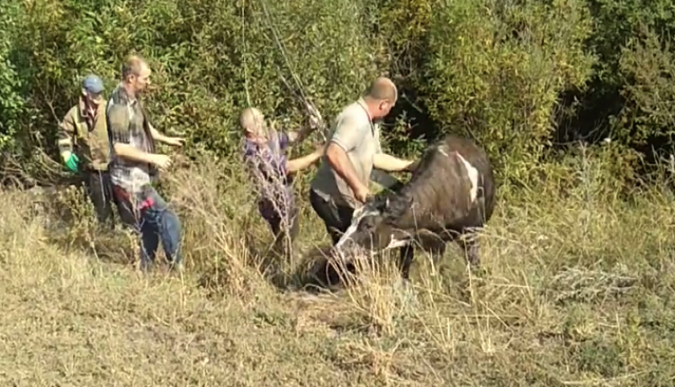 Инцидент произошел в районе села Коробочкино. Прибыв на мест и оценив обстановку, спасатели вызвали на место кран, после чего с помощью тросов закрепили животное и подняли его на поверхность. Судя по всему, серьезных травм буренка не получила.