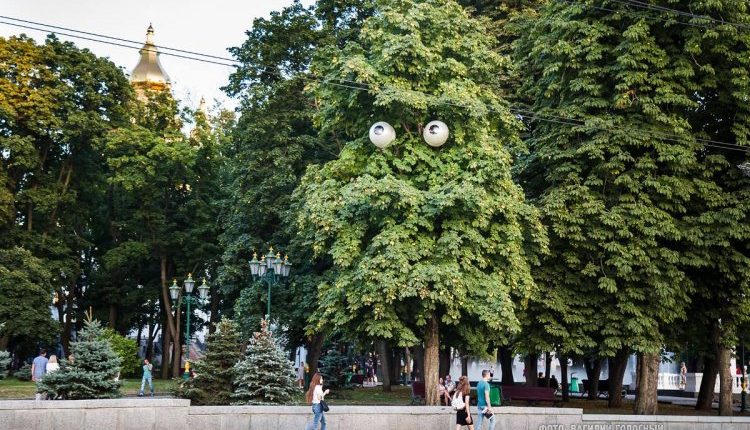 На снимке изображено дерево, расположенное рядом с Зеркальной струей. На высоте примерно десяти метров с помощью веревок закреплены два “глазных яблока” с нарисованными зрачками. В харьковской мэрии пока что не смогли ответить, является ли инсталляция проделкой шутников или же она была создана местными коммунальщиками.