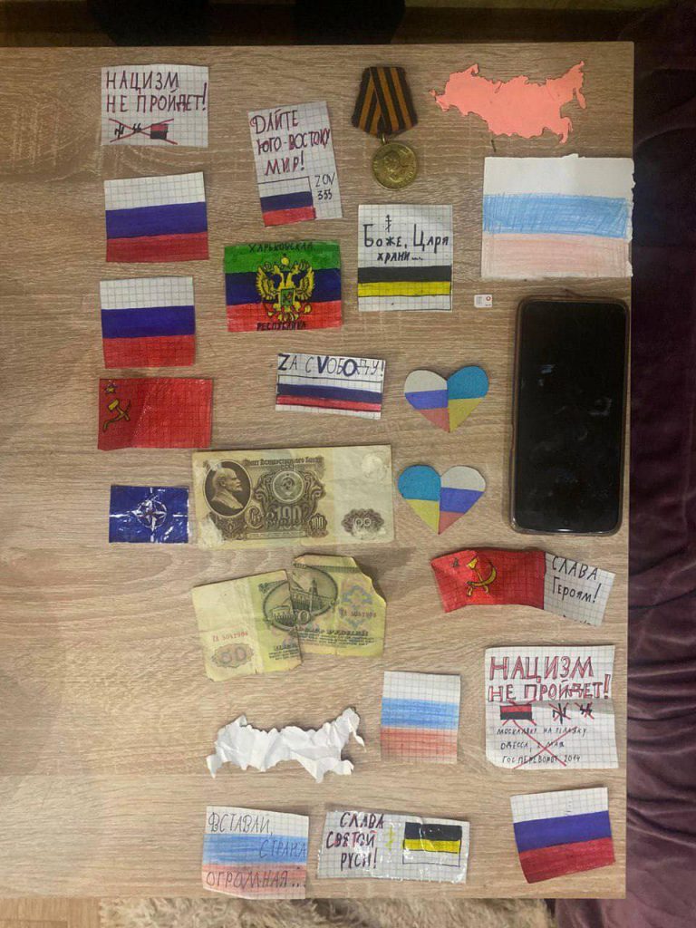 Під час обшуку у квартирі 14-річної школярки слідчі знайшли російські прапори, лозунги на підтримку царя і царської росії, а також радянську символіку, повідомив Сергій Болвінов, начальник Слідчого управління поліції Харківщини. За його словами, дівчина власноруч створила ці малюнки.