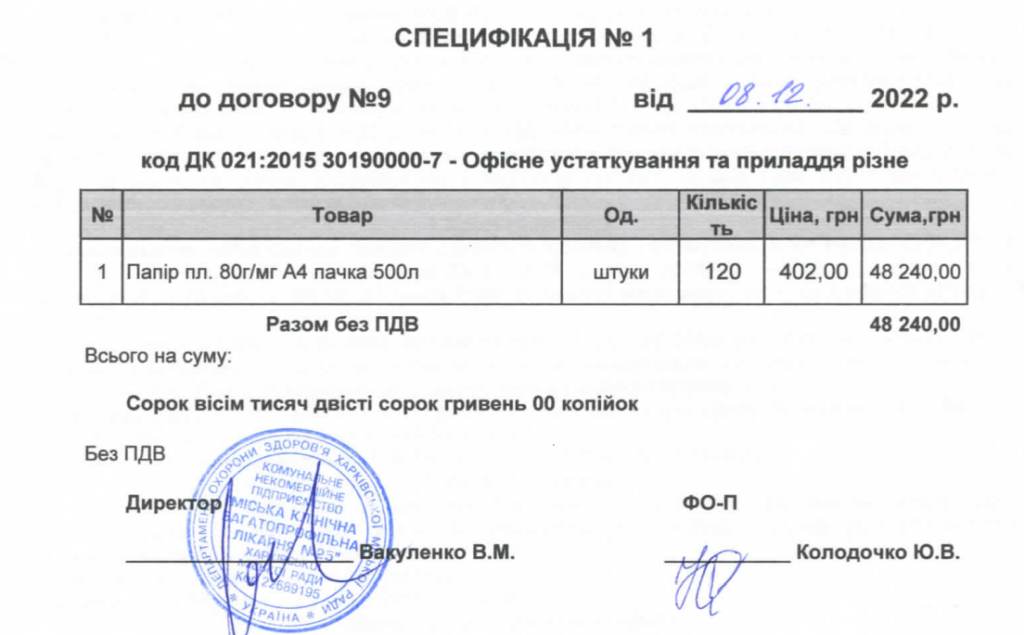 Согласно документам, опубликованным на сайте публичных закупок “Прозорро”, 8 декабря больница приобрела 120 пачек обычной офисной бумаги А4 по 500 листов. Цена одной пачки бумаги составляет 402 гривны.