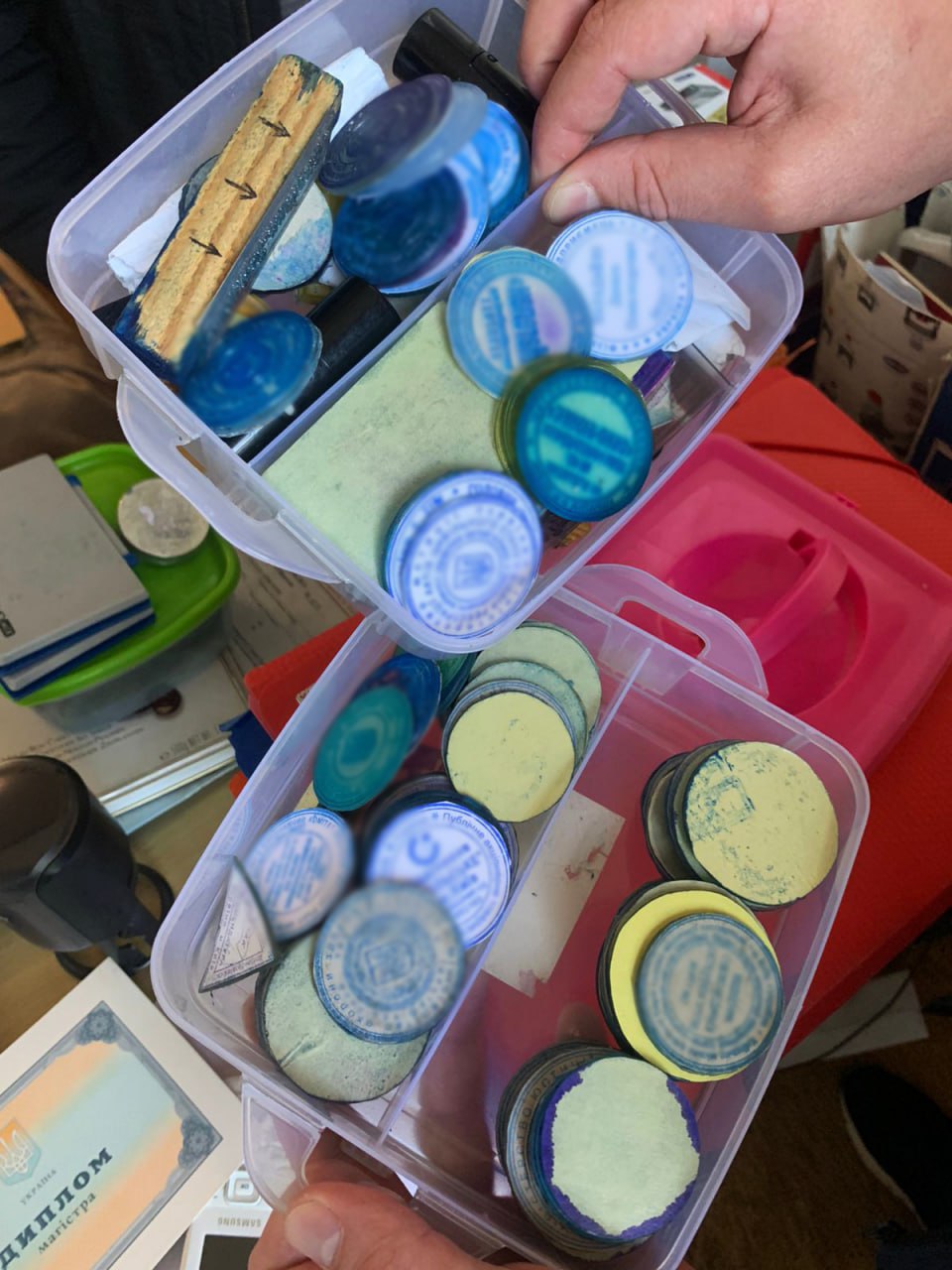 За час досудового розслідування правоохоронці за силової підтримки підрозділу «ТОР» Департаменту патрульної поліції провели понад 30 санкціонованих обшуків, у ході яких вилучили мобільні телефони, серверне обладнання, електронні носії інформації з наявними підробленими електронними документами, документацію, бланки, пристрої, за допомогою яких здійснювалася підробка та понад 3 тисячі фальшивих печаток та кліше.