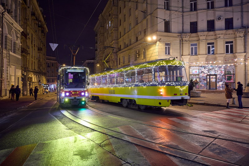 У Харкові міська влада прикрасила 18 трамваїв яскравими гірляндами та лампочками. Красиві вагони курсують містом за різними маршрутами, тому кожен може безплатно проїхатися на громадському транспорті у святковій атмосфері.