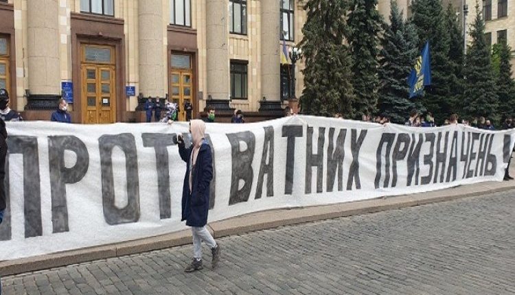 Затем участники акции оставили под зданием ХОГА баннер с надписью “Проти ватних призначень”, а на ступеньках – фотографии событий 2014 года. Кроме того, активисты передали письмо Алексею Кучеру и требовали, чтобы он вышел к ним, однако губернатор так и не появился.