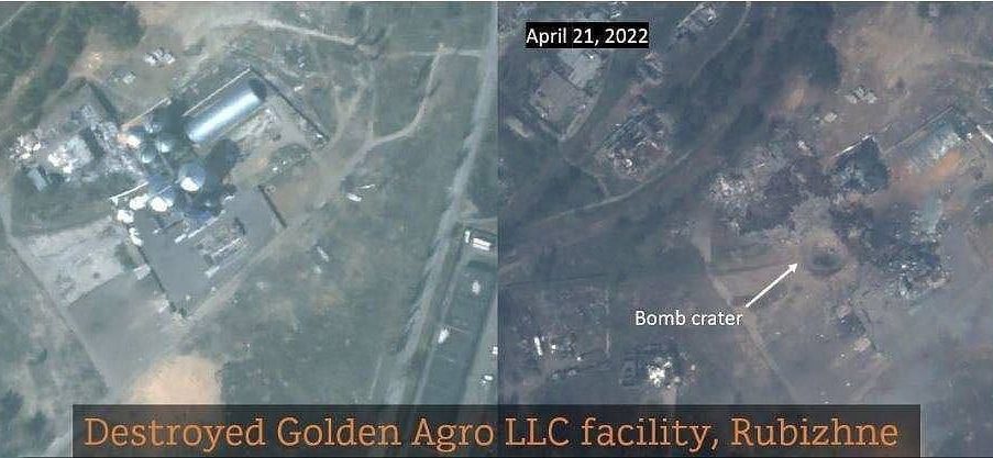 “Спутниковые снимки от компании Planet Lab свидетельствуют о том, что на территорию ООО “Голден АГРО” в Рубежном были сброшены мощные российские бомбы. Открытый в 2020 году элеваторный комплекс был полностью уничтожен. На предприятии была установлена лаборатория с самым современным оборудованием, включая экспресс-анализатор, который обеспечивал точные и быстрые анализы всех культур, зерносушилка мощностью 1500 тонн в сутки, сепаратор, автовес, автоматический пробоотборник. Элеваторный комплекс мог хранить 30 тысяч тонн зерна одновременно. Рашисты хотят устроить Голодомор. В оккупированных городах зафиксированы случаи вывоза нашего зерна в РФ. Ранее они также уничтожили все продукты в Северодонецке”, — говорится в сообщении.
