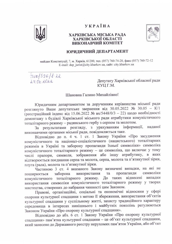 “Тут со вчерашнего дня в телеграмм-каналах и новостных сайтах разгоняют “зраду”, что горсовет отказывается снимать со здания советскую символику. Ссылка — на ответ юрдепартамента. К сожалению, вынужден констатировать, что коллеги из этого департамента ответили, руководствуясь буквой, но никак не духом закона. Мэр города Игорь Терехов уже давно принял решение, что герба несуществующей советской Украины на строении городского совета не будет. И так же давно решил, что на здании, из которого осуществляется управление городом, будет герб города-героя Харькова. Что очень логично. Сегодня Игорь Терехов дал задание, чтобы соответствующие работы начались в ближайшее время. Так что дождитесь – недолго осталось!”, — написал Юрий Сидоренко.