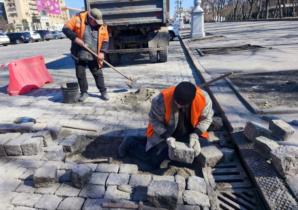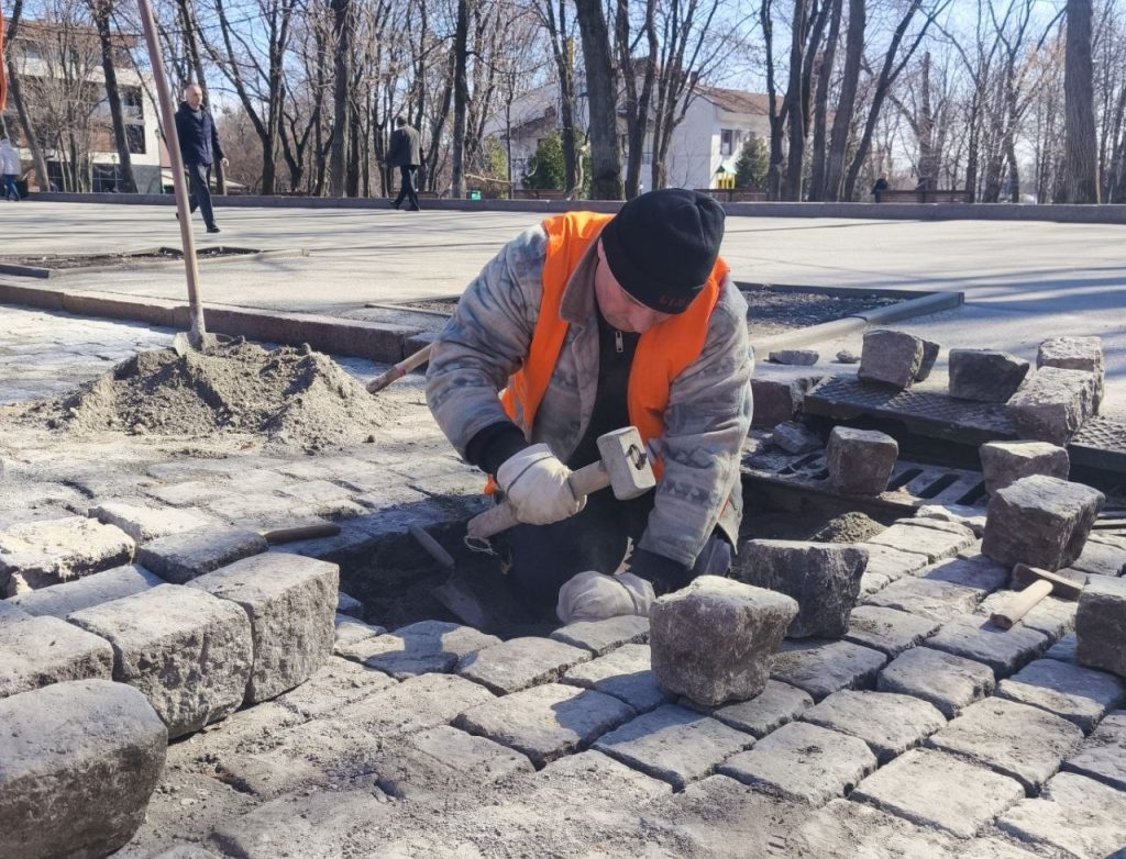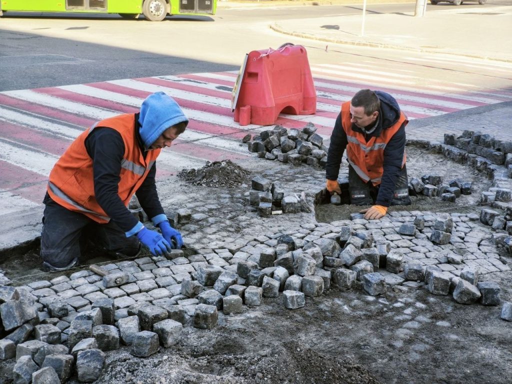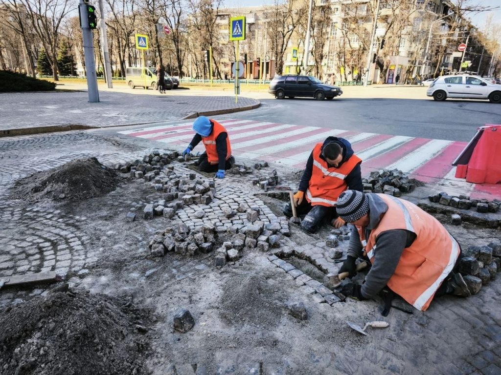 Перекладають бруківку в центрі Харкова працівники комунального підприємства «Шляхрембуд».