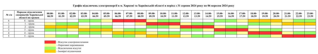 У “Харківобленерго” опублікували графік погодинних знеструмлень, який діятиме до 6 вересня включно.