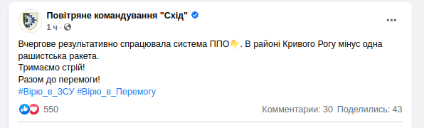 Кроме того силы ПВО сбили сегодня российскую ракету в районе Кривого Рога.
