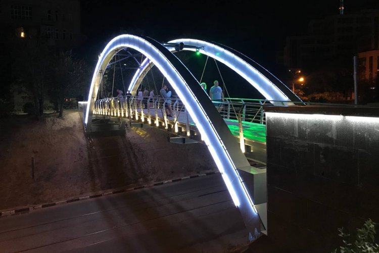 Так, на кадрах видно, что арочную конструкцию и стойки перил решили выделить светлыми тонами, а часть пешеходной дорожки со стороны зоопарка переливается яркими цветами.