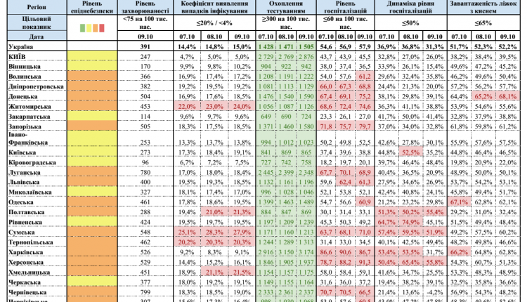 По данным МОЗ, уровень заболеваемости в регионе составляет 526 человек на 100 тысяч населения. Оптимальным показателем считается заболеваемость меньше 75 человек на 100 тысяч жителей. Коэффициент выявления случаев инфицирования в области остановился на отметке в 9,1%, при оптимальном показателе в 20%. Загруженность кроватей с кислородом в регионе составляет 62.8% при норме менее 65%. Уровень госпитализации достигает 86,7, при норме в 60 человек на 100 тысяч жителей. Этот показатель на сегодняшний день соответсвует параметрам “красной зоны”.