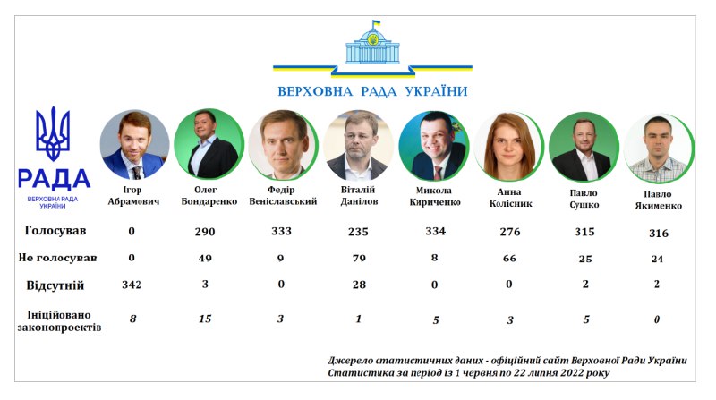Серед обраних за списками партій депутатів, яких можна вважати представниками Харківського регіону, 7 із 8-ми досить активно брали участь у голосуваннях у період із 1 червня по 22 липня. Виключенням є Ігор Абрамович, який, за повідомленням ЗМІ, після початку війни перебрався з України до Франції та звідти дистанційно спів-головує (в партнерстві з київським бізнесменом Вадимом Столаром) у новоствореній депутатській групі «Відновлення України».