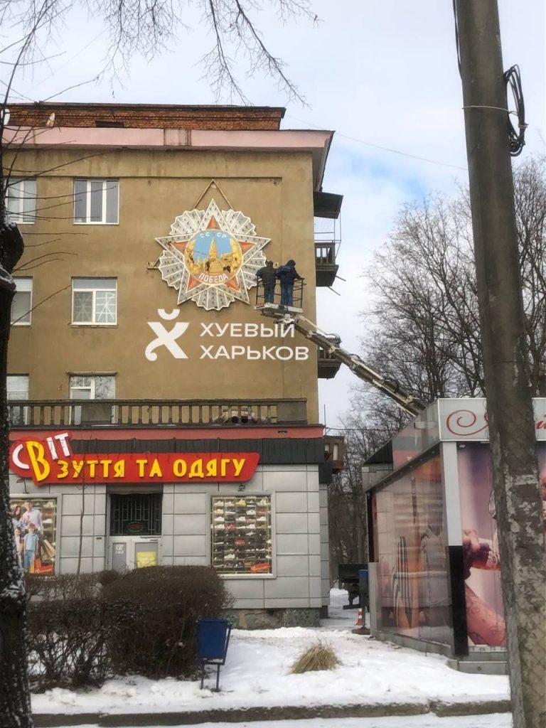 З фасаду житлового будинку, який розташований на вулиці Миру в районі ХТЗ демонтують макет ордена “Перемоги”.