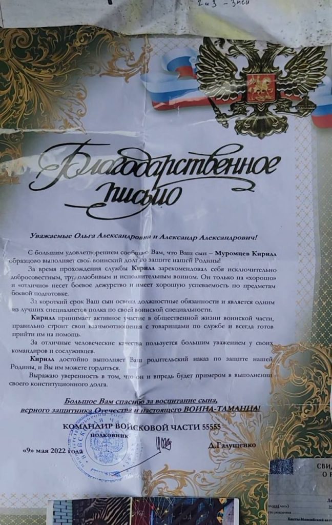 “Деякі знахідки серед особистих речей загарбників часом дуже дивують. Подяки, які не були надіслані батькам, а просто видані бійцям. Окрім того, текст в подяках однаковий. Верх цинізму з боку військового командування рф”, – написав Анатолій Сидоренко в Telegram.