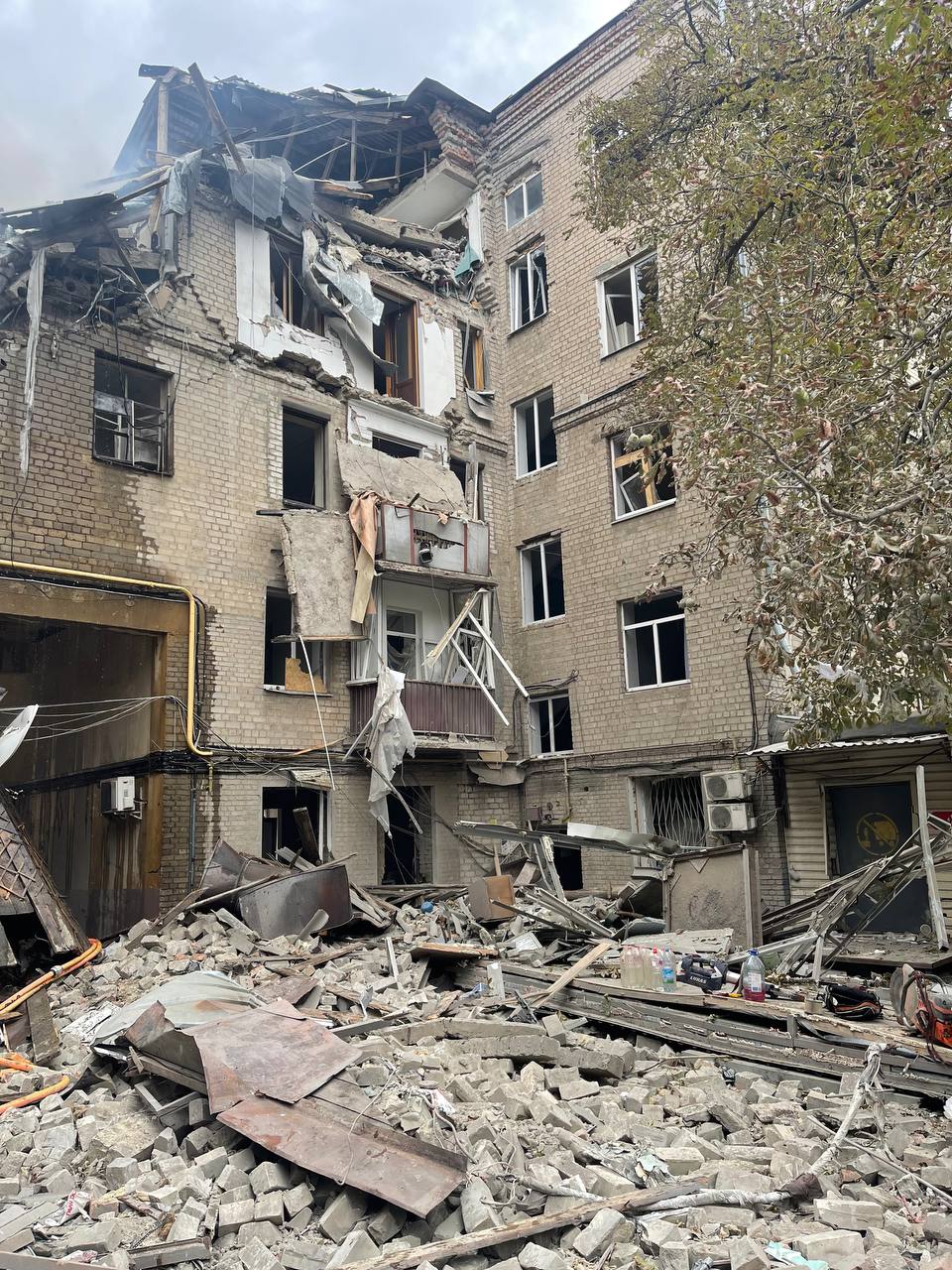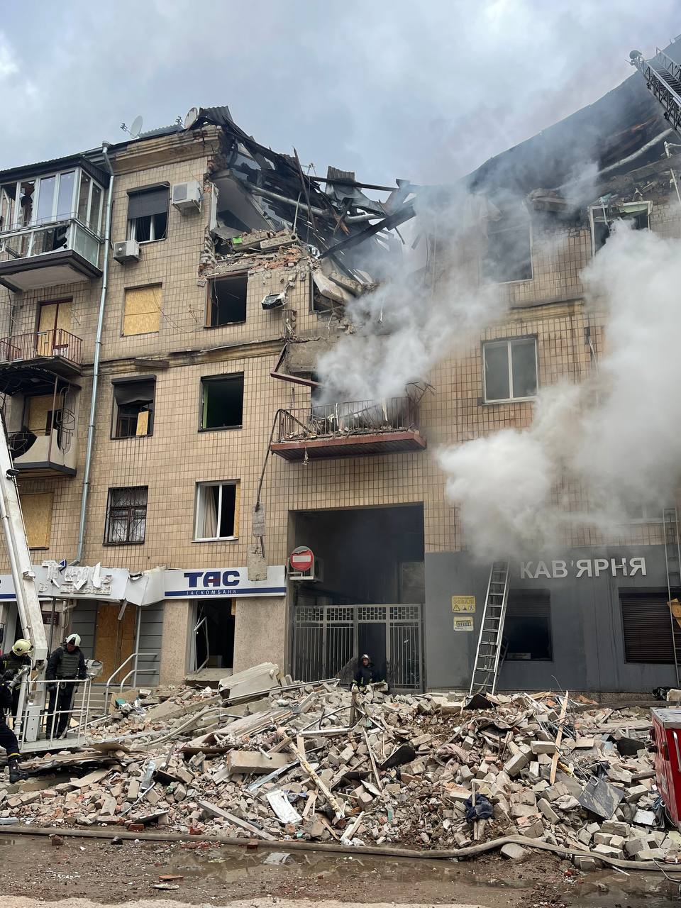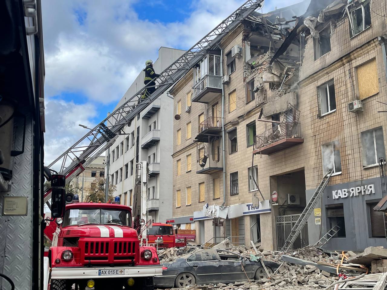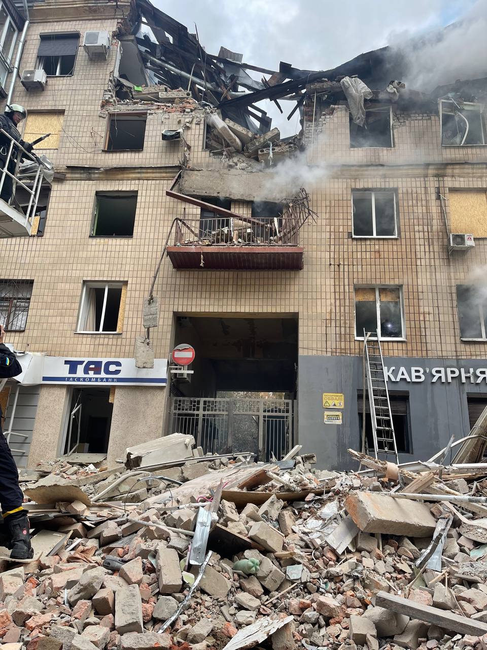“В історичному центрі Харкова стався обстріл. П’ятиповерхова будівля частково зруйнована. Під бетонними уламками виникла пожежа. Звичайним способом згасити полум’я немає можливості – заважають плити. Ми розбиваємо капітальні стіни для того, щоб подати пожежні стволи до джерела займання. Внаслідок влучення ракети один із під’їздів п’ятиповерхового будинку зруйнований від даху до самого підвалу. Це історичний центр Харкова, звичайний будинок, у якому мешкали мирні люди”, – розповів кореспонденту Newsroom Анатолій Торяник.