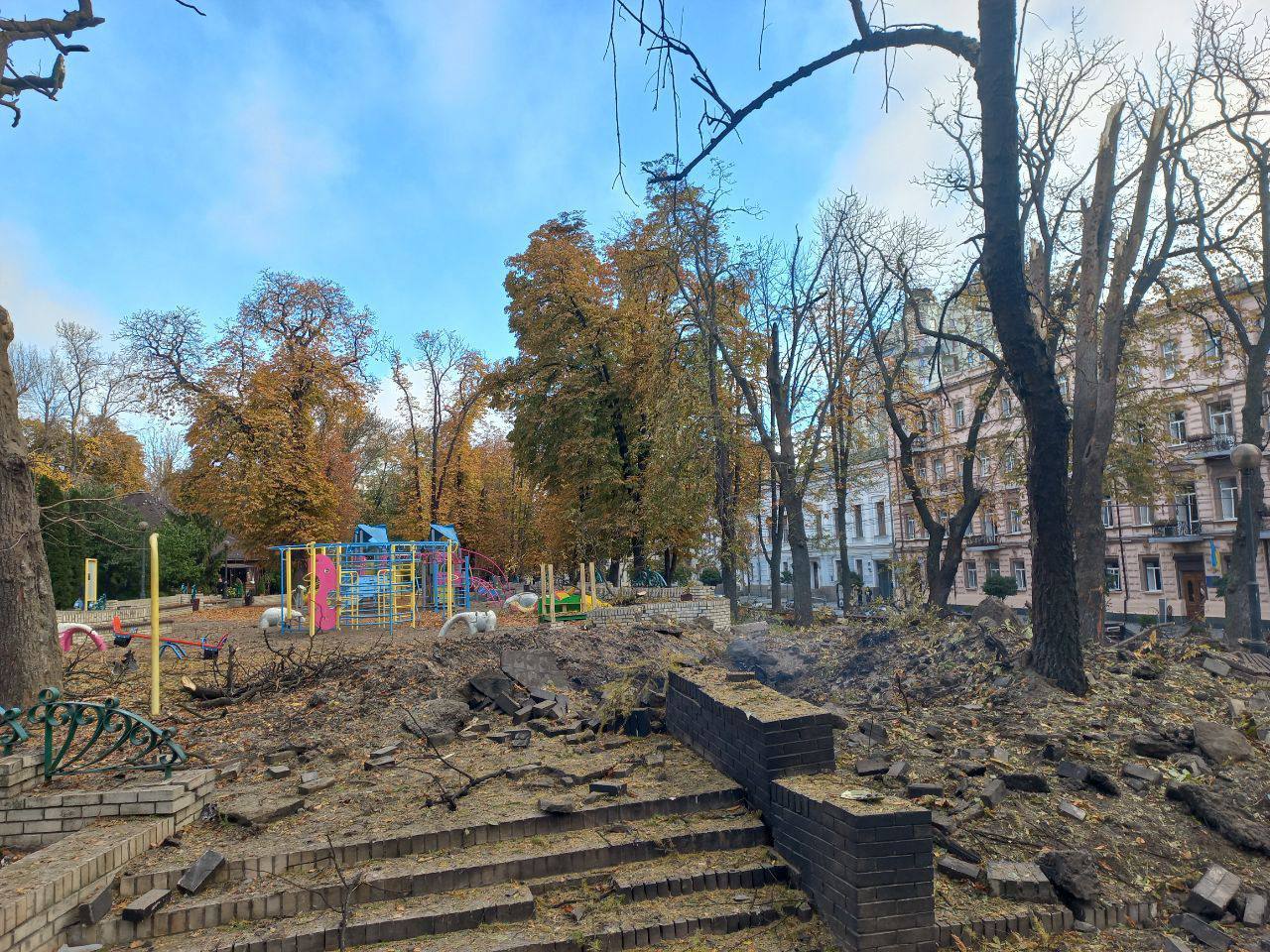 Внаслідок ракетного обстрілу пошкоджено будівлі вищого навчального закладу, житлові та офісні будинки в центрі Києва. Одна з ракет влучила на територію дитячого майданчика.