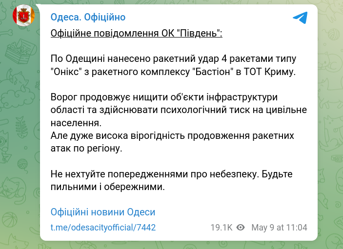 “По Одесской области нанесен ракетный удар 4 ракетами типа “Оникс” из ракетного комплекса “Бастион” в Крыму. Враг продолжает уничтожать объекты инфраструктуры области и оказывать психологическое давление на гражданское население”, — сказано в сообщении.