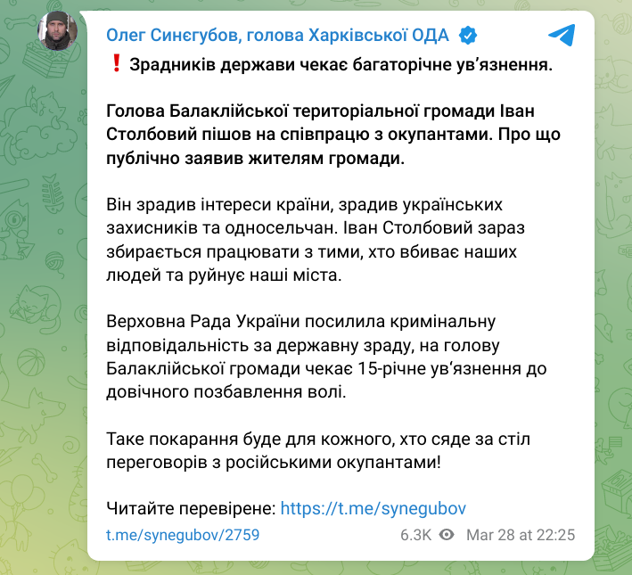 “Главу Балаклейской общины ждет от 15 лет заключения до пожизненного лишения свободы. Такое наказание будет для каждого, кто сядет за стол переговоров с русскими оккупантами!” – написал Синегубов.
