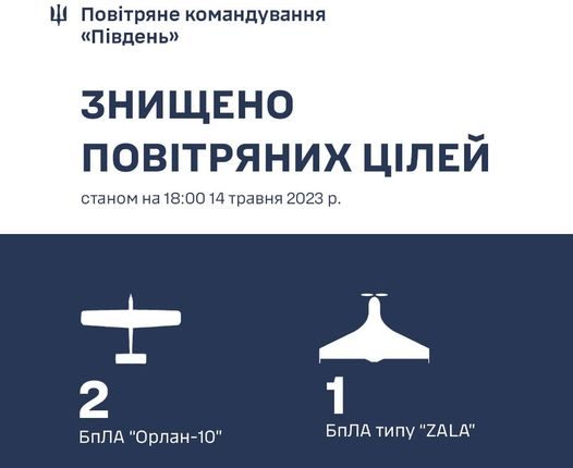 “14 травня 2023 року на Херсонщині силами і засобами протиповітряної оборони повітряного командування “Південь” знищено 3 російські безпілотні літальні апарати: два розвідувальні БПЛА “Орлан-10″ і один безпілотник типу ZALA”, — ідеться в повідомленні.