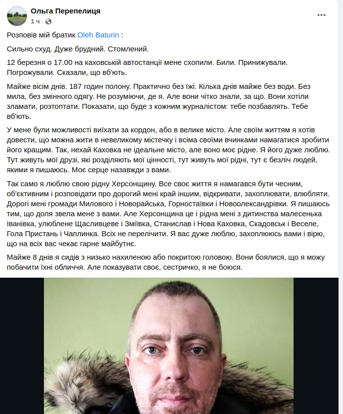 “12 марта в 17:00 на каховской автостанции меня схватили. Били. Унижали. Угрожали. Сказали, что убьют. Почти восемь дней. 187 часов плена. Практически без еды. Несколько дней почти без воды. Без мыла, без сменной одежды. Не понимая, где я. Но они точно знали, за что. Они хотели сломать, растоптать. Показать, что будет с каждым журналистом. Почти 8 дней я сидел с низко наклоненной головой. Они боялись, что я могу увидеть их лица, но показывать свое я не боюсь”, – рассказал Батурин.